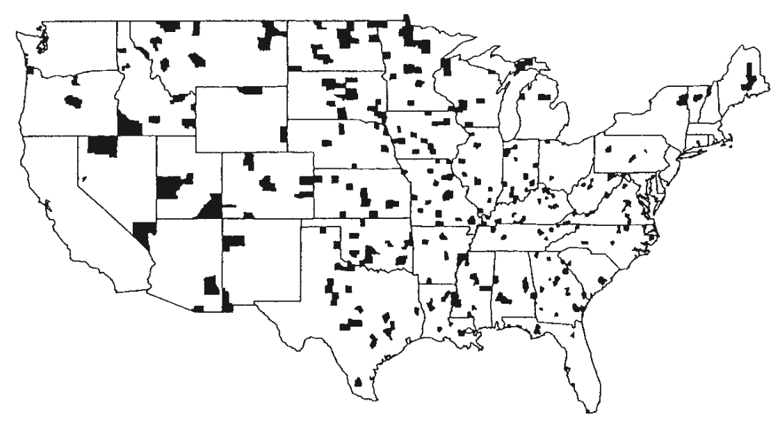 Counties of the U.S. within the top 10% of death rates for kidney cancer for white males, 1980-1989.