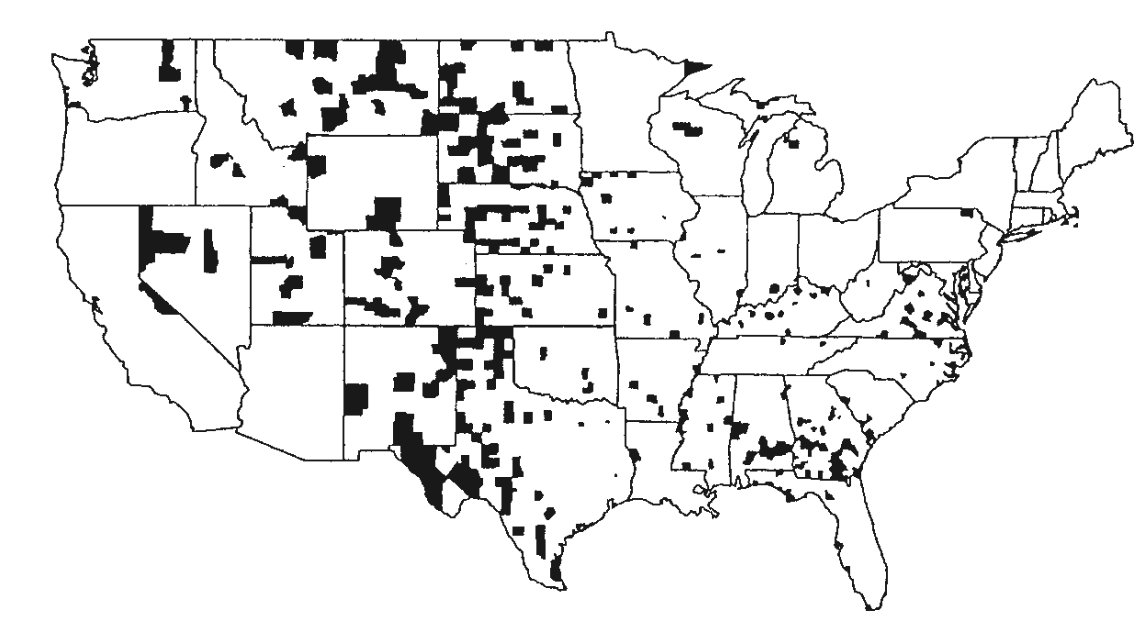 Counties of the U.S. within the bottom 10% of death rates for kidney cancer for white males, 1980-1989.