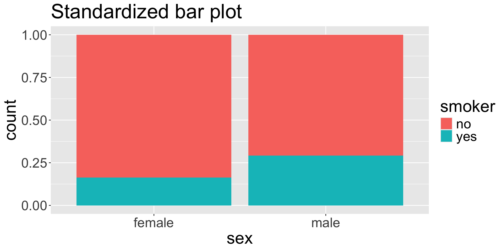 The standardized bar plot visualizes these row-wise or column-wise proportions.