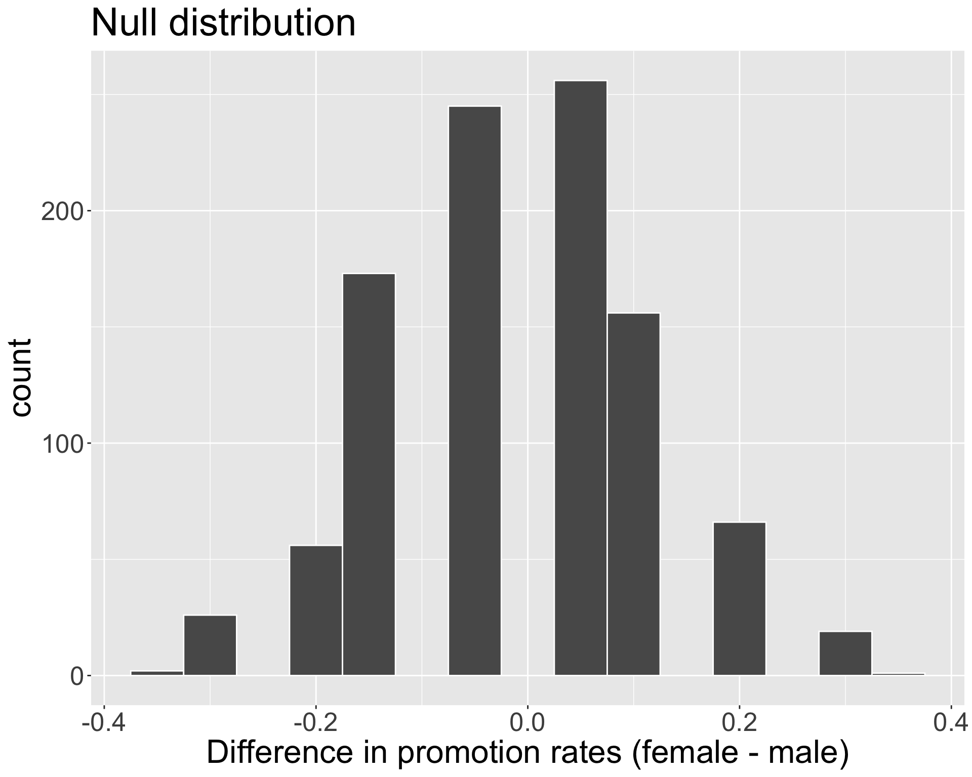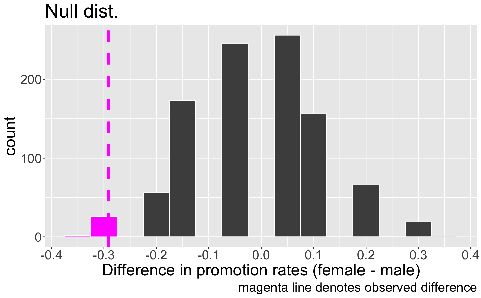 }Recall, the observed difference in our data was \(\hat{p}_{f,obs} - \hat{p}_{m,obs} =\) -0.2916667.